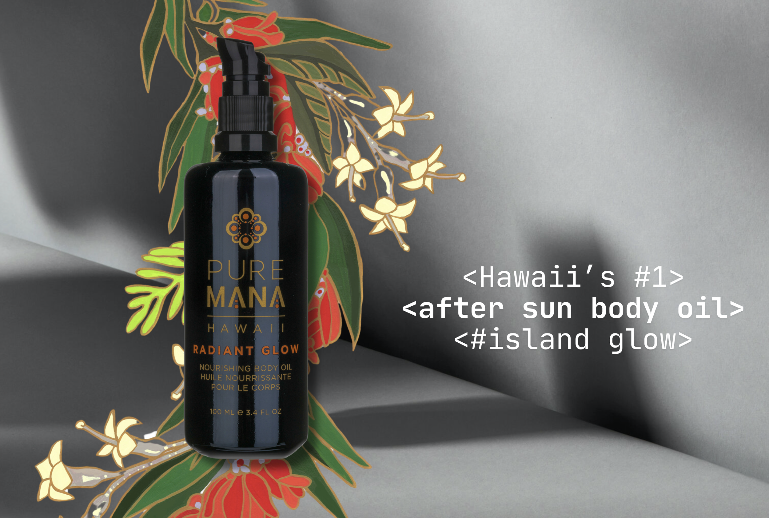Escape to the islands with radiant skin, before, during, and after your vacation. Pure Mana Radiant Glow, Hawaii's #1 body oil, is your secret weapon for achieving that enviable island glow.